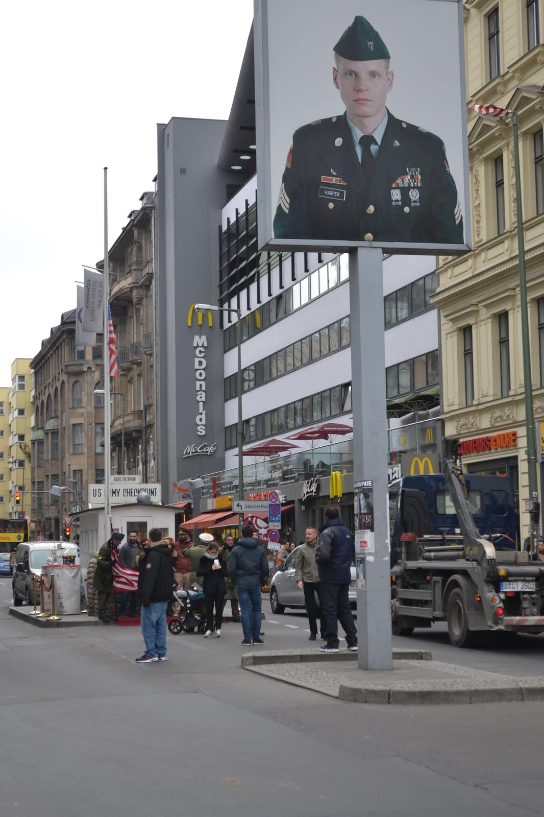 Caminamos al Check Point Charlie, que fue uno de los pocos puntos de comunicación y paso entre las dos Alemania, y que hoy, como punto turístico presenta varias contradicciones: tiene un McDonalds justo frente a la estrella comunista y el puesto de control de antaño recreado con uniformados del lado soviético y del americano, prestan la gorra para la foto del recuerdo con total banalidad.